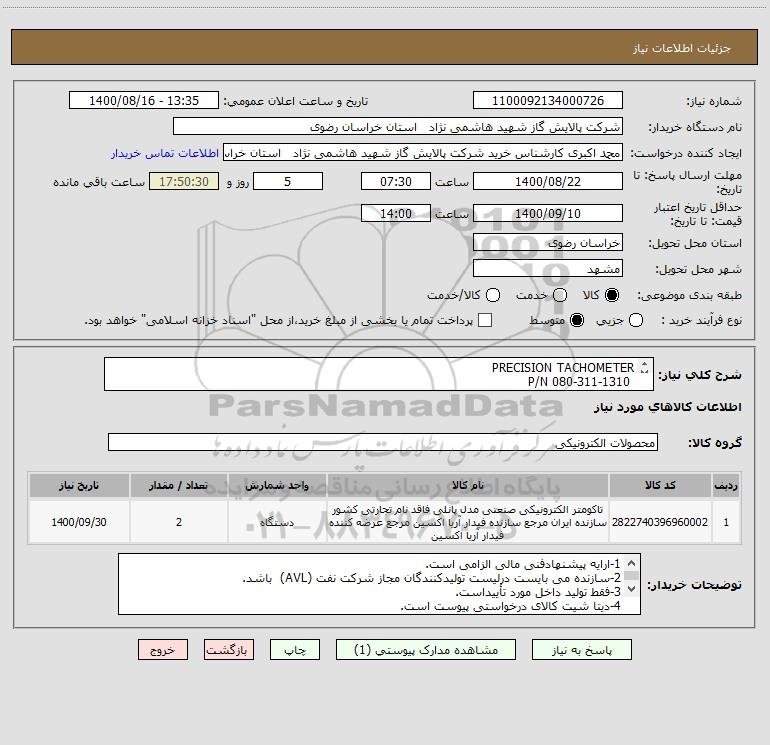 نام دستگاه خریدار:شرکت پالایش گاز شهید هاشمی نژاد استان خراسان رضوی