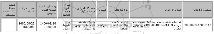 | 2000092447000117 | فراخوان ارزیابی کیفی مناقصه عمومی دو مرحله ای RNL-0048014-MH خرید پوتین ایمنی | ارزیابی کیفی برای مناقصه عمومی | مرکزی | شرکت پالایش نفت امام خمینی ره شازند | خرید ملزومات ایمنی | 1400/08/16 14:00:00 | 1400/08/22 15:00:00 |