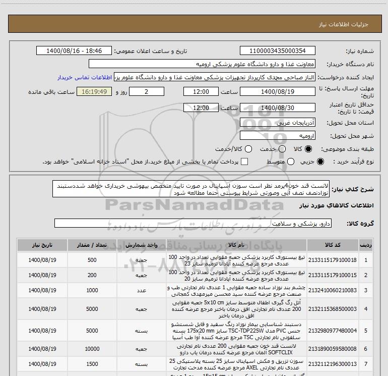شرح کلی نیاز: لانست قند خون4پرمد نظر است سوزن اسپاینال در صورت تایید متخصص بیهوشی خریداری خواهد شددستبند نوزادنصف نصف آبی وصورتی شرایط پیوستی حتما مطالعه شود