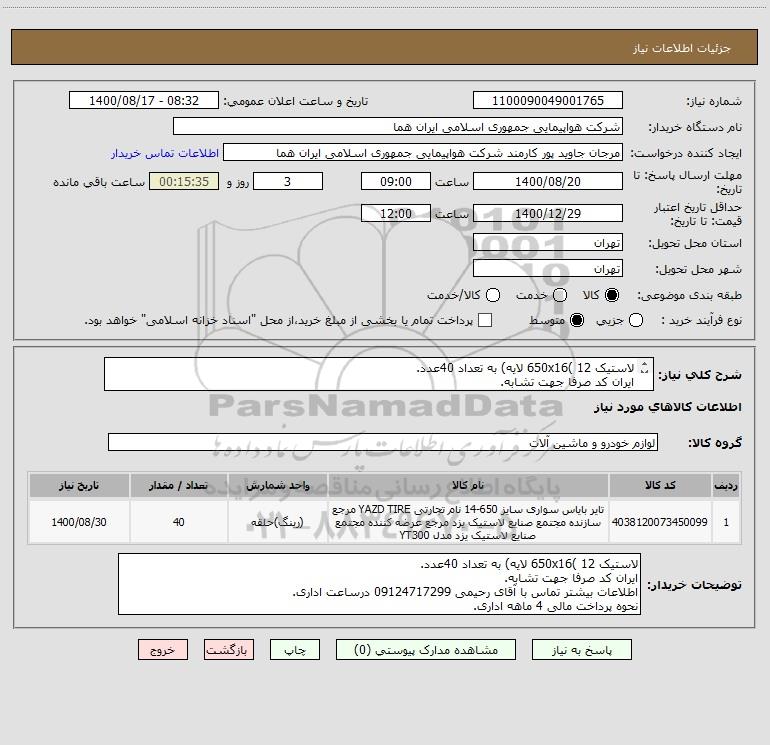 شرح کلی نیاز: لاستیک 650x16( 12 لایه) به تعداد 40عدد.