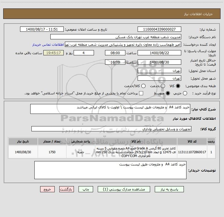 نام دستگاه خریدار:مدیریت شعب منطقه غرب تهران بانک مسکن