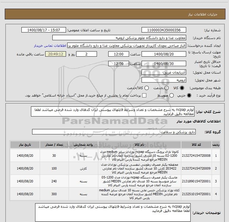 شرح کلی نیاز: لوازم ncpap به شرح مشخصات و تعداد وشرایط فایلهای پیوستی ایران کدهای وارد شده فرضی میباشد لطفا مطالعه دقیق فرمایید