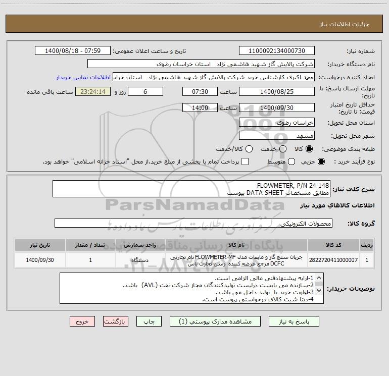 شرح کلی نیاز: FLOWMETER, P/N 24-148