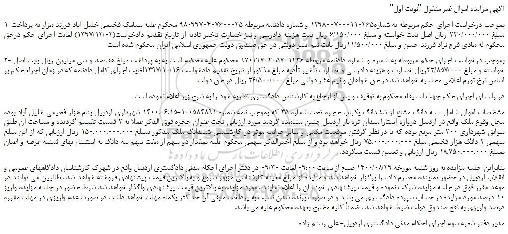 "آگهی مزایده اموال غیر منقول "نوبت اول