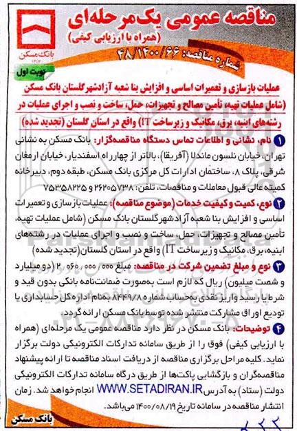 عملیات بازسازی و تعمیرات اساسی و افزاش بنا شعبه آزادشهر گلستان بانک مسکن (شامل عملیات تهیه، تامین مصالح و تجهیزات، حمل، ساخت و نصب و اجرای عملیات در رشته های ابنیه، برق، مکانیک و زیرساخت IT) واقع در استان گلستان (تجدید شده)