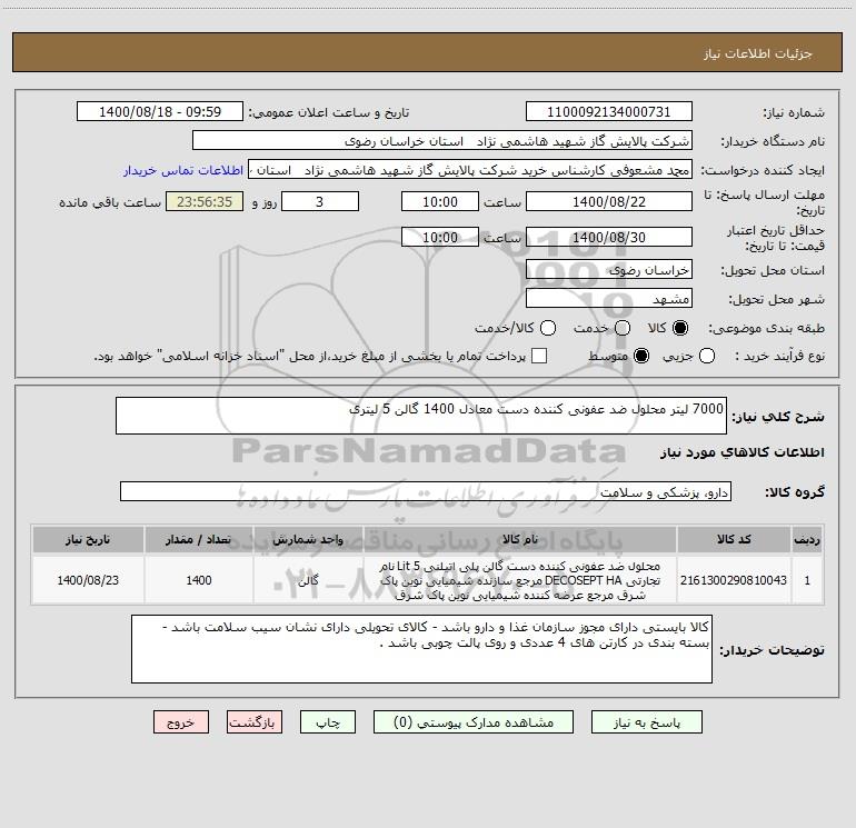 نام دستگاه خریدار:شرکت پالایش گاز شهید هاشمی نژاد استان خراسان رضوی