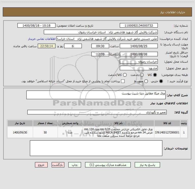 شرح کلی نیاز: ورق میکا مطابق دیتا شیت پیوست