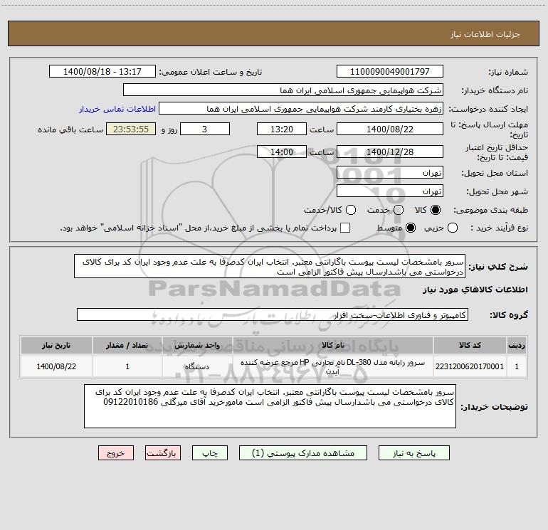 استعلام سرور بامشخصات لیست پیوست باگارانتی معتبر. انتخاب ایران کدصرفا به علت عدم وجود ایران کد برای کالای درخواستی می باشدارسال پیش فاکتور الزامی است , استعلام سرور بامشخصات لیست پیوست باگارانتی معتبر. انتخاب ایران کدصرفا به علت عدم وجود ایران کد برای کالای درخواستی می باشدارسال پیش فاکتور الزامی است