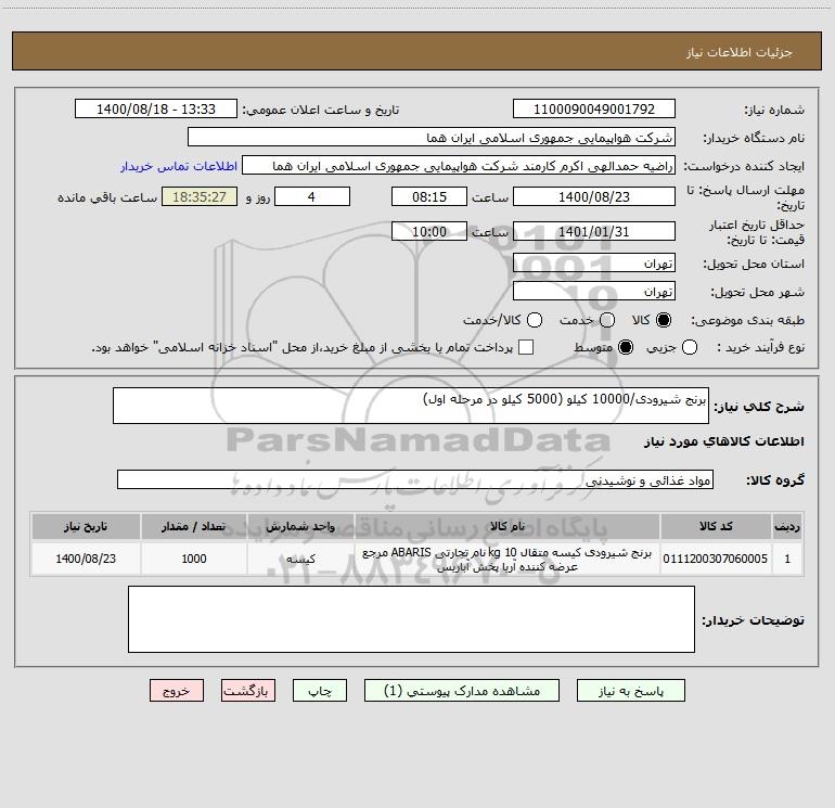 شرح کلی نیاز: برنج شیرودی/10000 کیلو (5000 کیلو در مرحله اول)