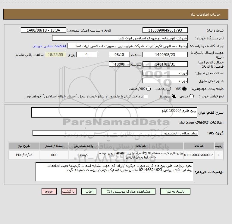 شرح کلی نیاز: برنج طارم /10000 کیلو