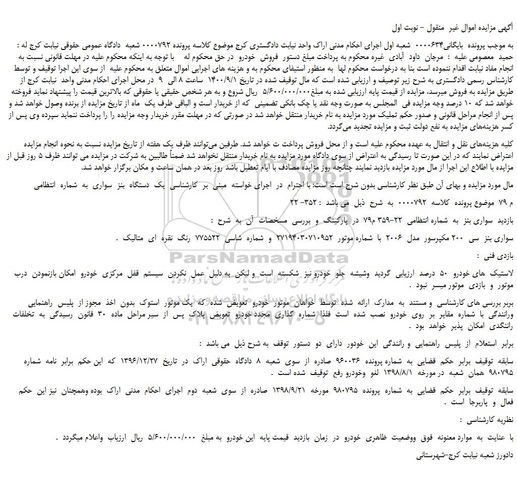مال مورد مزایده و بهای آن طبق نظر کارشناسی بدون شرح است است: با احترام در اجرای خواسته مبنی بر کارشناسی یک دستگاه بنز سواری به شماره انتظامی