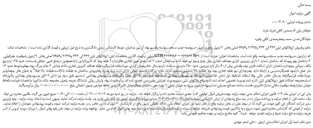حکم برفروش ازپلاکهای ثبتی432 الی 434 و2/435 و7656 اصلی بخش 2 اردبیل واقع دراردبیل-سرچشمه-جنب مسجدسرچشمه وتقسیم بهاء آن بین صاحبان، توسط کارشناس رسمی دادگستری به شرح ذیل ارزیابی و قیمت گذاری شده است./. مشخصات ملک: