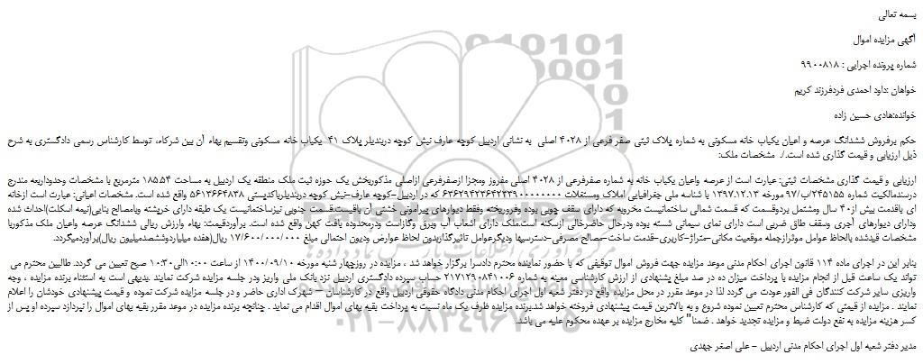 حکم برفروش ششدانگ عرصه و اعیان یکباب خانه مسکونی به شماره پلاک ثبتی صفر فرعی از 4028 اصلی به نشانی اردبیل کوچه عارف نبش کوچه دربندیلر پلاک 41 یکباب خانه مسکونی وتقسیم بهاء آن بین شرکاء، توسط کارشناس رسمی دادگستری به شرح ذیل ارزیابی و قیمت گذاری شده است./. مشخصات ملک: