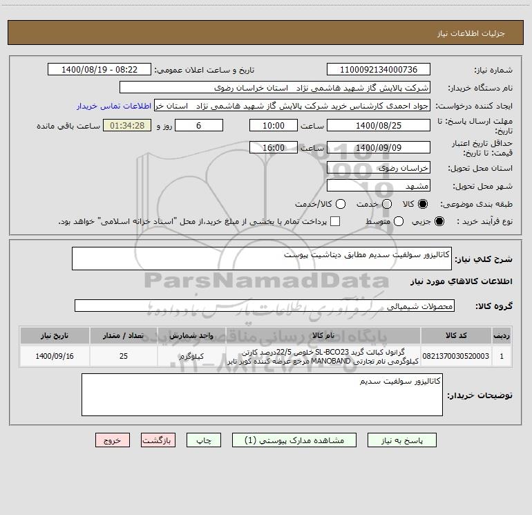 شرح کلی نیاز: کاتالیزور سولفیت سدیم مطابق دیتاشیت پیوست