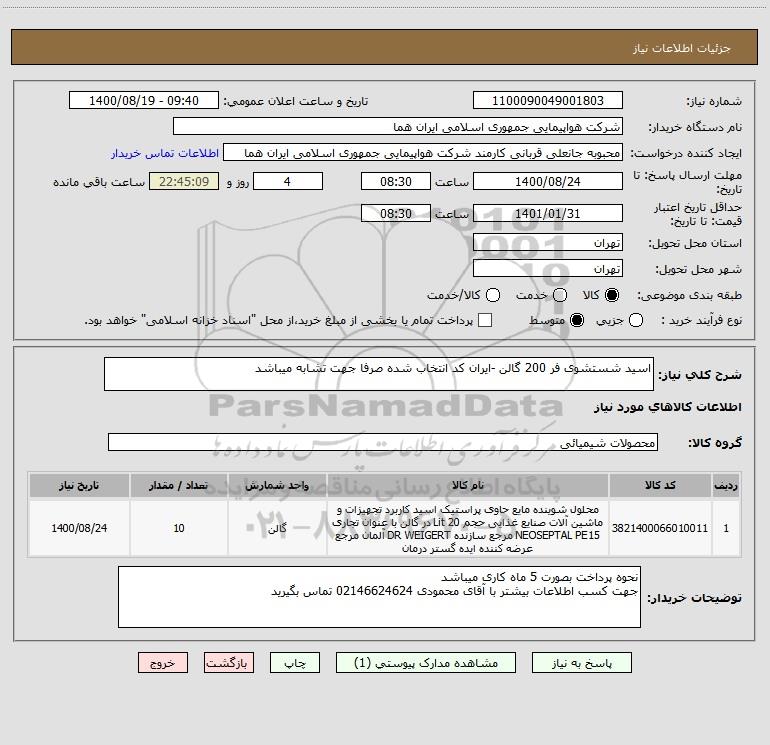 شرح کلی نیاز: اسید شستشوی فر 200 گالن -ایران کد انتخاب شده صرفا جهت تشابه میباشد