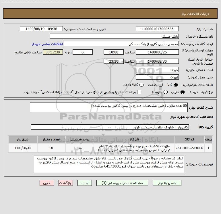 شرح کلی نیاز: 60 عدد ماژول (طبق مشخصات مندرج در پیش فاکتور پیوست شده)