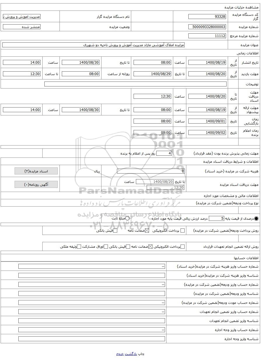 | عنوان مزایده | مزایده املاک آموزشی مازاد مدیریت آموزش و پرورش ناحیه دو شهرری | |||