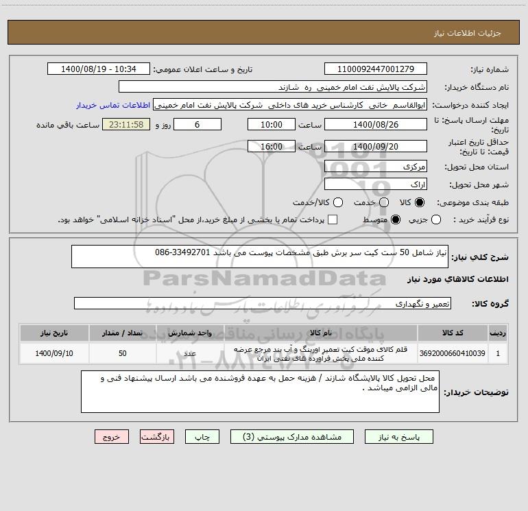 شرح کلی نیاز: نیاز شامل 50 ست کیت سر برش طبق مشخصات پیوست می باشد 33492701-086