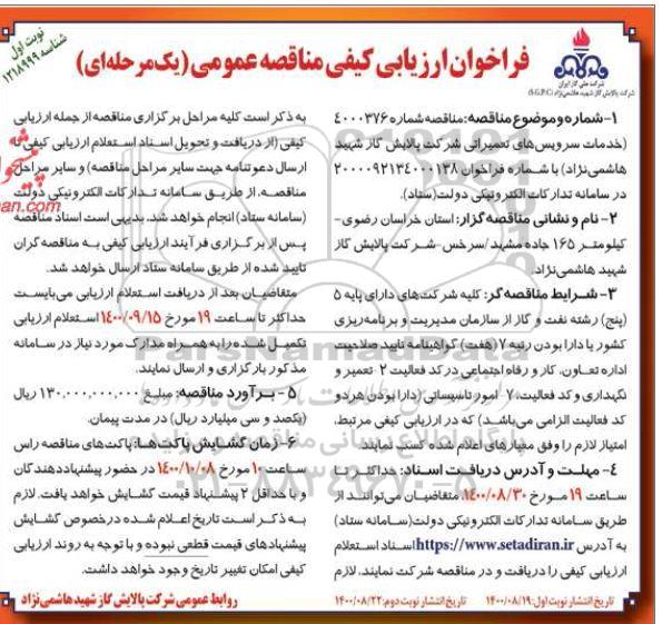 خدمات سرویس دهی های تعمیراتی شرکت پالایش گاز شهید هاشمی نژاد با شماره فراخوان 2000092134000138 در سامانه تدارکات الکترونیکی دولت