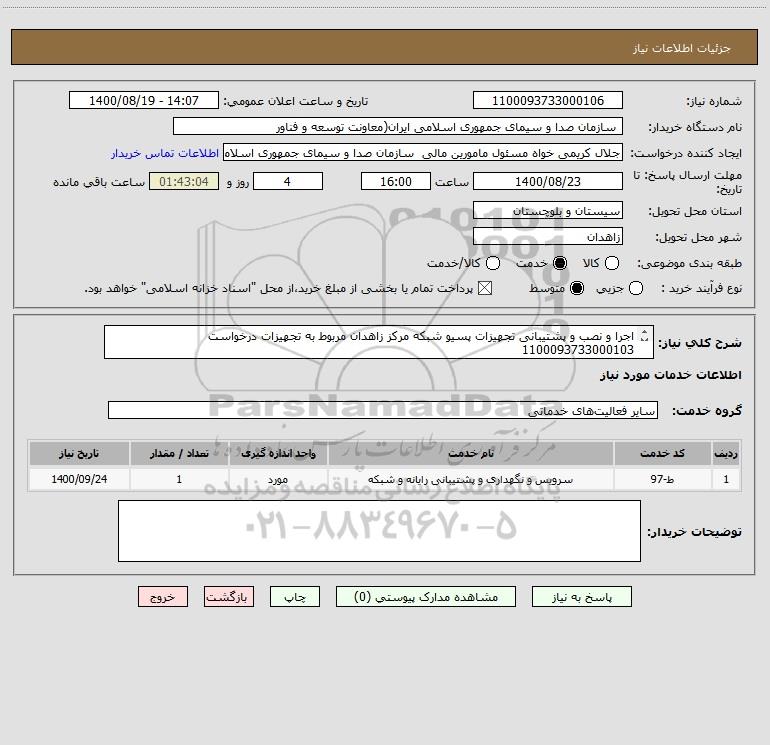 شرح کلی نیاز: اجرا و نصب و پشتیبانی تجهیزات پسیو شبکه مرکز زاهدان مربوط به تجهیزات درخواست 1100093733000103