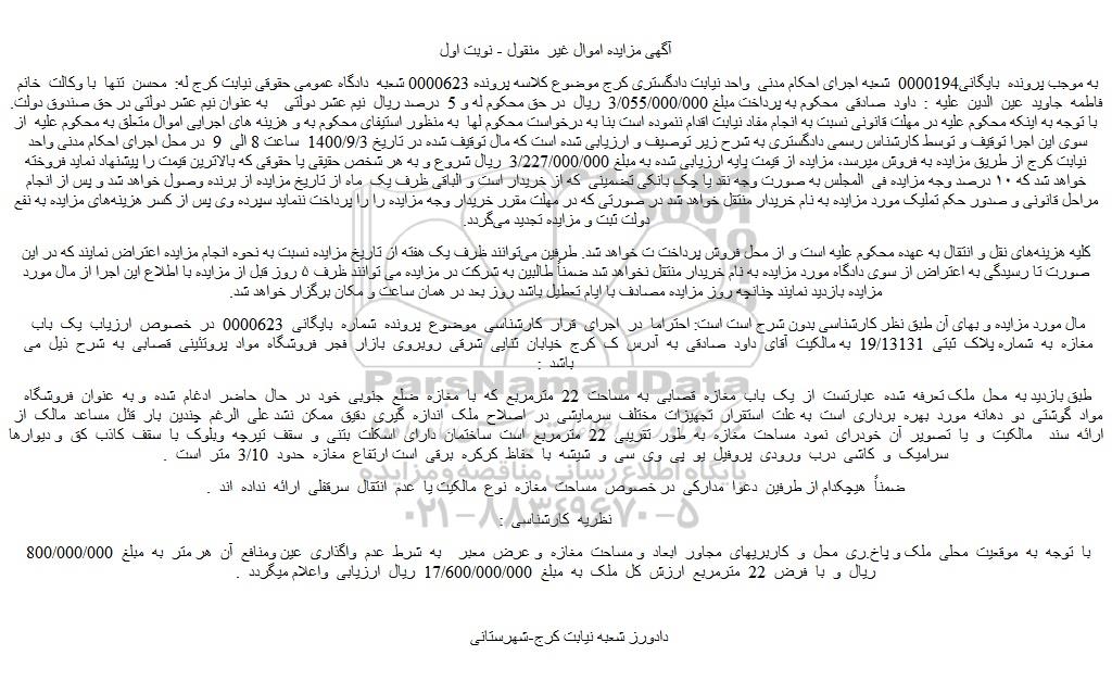 به موجب پرونده بایگانی0000194 شعبه اجرای احکام مدنی واحد نیابت دادگستری کرج موضوع کلاسه پرونده 0000623 شعبه دادگاه عمومی حقوقی نیابت کرج له: محسن تنها با وکالت خانم فاطمه جاوید عین الدین علیه : داود صادقی محکوم به پرداخت مبلغ 3/055/000/000 ریال در حق محکوم له و 5 درصد ریال نیم عشر دولتی به عنوان نیم عشر دولتی در حق صندوق دولت. با توجه به اینکه محکوم علیه در مهلت قانونی نسبت به انجام مفاد نیابت اقدام ننموده است بنا به درخواست محکوم لها به منظور استیفای محکوم به و هزینه های اجرایی اموال متعلق به محکوم علیه از سوی این اجرا توقیف و توسط کارشناس رسمی دادگستری به شرح زیر توصیف و ارزیابی شده است که مال توقیف شده در تاریخ 1400/9/3 ساعت 8 الی 9 در محل اجرای احکام مدنی واحد نیابت کرج از طریق مزایده به فروش میرسد، مزایده از قیمت پایه ارزیابی شده به مبلغ 3/227/000/000 ریال شروع و به هر شخص حقیقی یا حقوقی که بالاترین قیمت را پیشنهاد نماید فروخته خواهد شد که ۱۰ درصد وجه مزایده فی المجلس به صورت وجه نقد یا چک بانکی تضمینی که از خریدار است و الباقی ظرف یک ماه از تاریخ مزایده از برنده وصول خواهد شد و پس از انجام مراحل قانونی و صدور حکم تملیک مورد مزایده به نام خریدار منتقل خواهد شد در صورتی که در مهلت مقرر خریدار وجه مزایده را را پرداخت ننماید سپرده وی پس از کسر هزینه های مزایده به نفع دولت ثبت و مزایده تجدید می گردد.