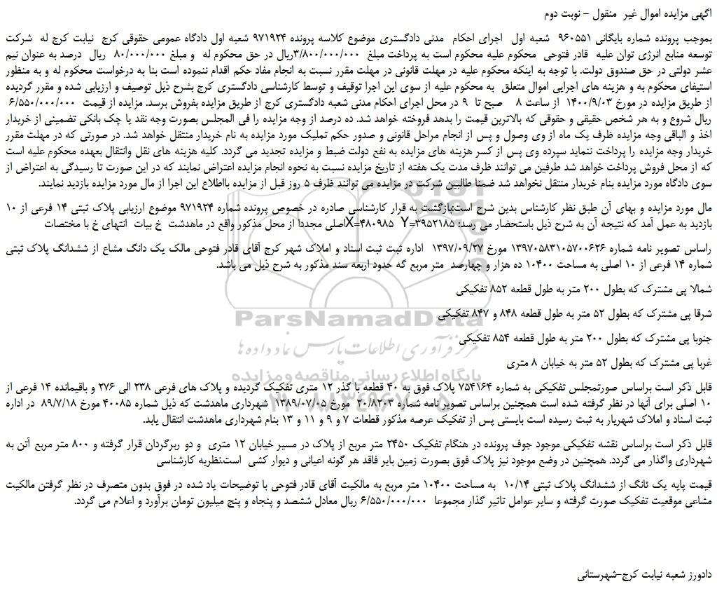 بموجب پرونده شماره بایگانی 960551 شعبه اول اجرای احکام مدنی دادگستری موضوع کلاسه پرونده 971924 شعبه اول دادگاه عمومی حقوقی کرج نیابت کرج له شرکت توسعه منابع انرژی توان علیه قادر فتوحی محکوم علیه محکوم است به پرداخت مبلغ 3/800/000/000ریال در حق محکوم له و مبلغ 80/000/000 ریال درصد به عنوان نیم عشر دولتی در حق صندوق دولت. با توجه به اینکه محکوم علیه در مهلت قانونی در مهلت مقرر نسبت به انجام مفاد حکم اقدام ننموده است بنا به درخواست محکوم له و به منظور استیفای محکوم به و هزینه های اجرایی اموال متعلق به محکوم علیه از سوی این اجرا توقیف و توسط کارشناسی دادگستری کرج بشرح ذیل توصیف و ارزیابی شده و مقرر گردیده از طریق مزایده در مورخ 1400/9/03 از ساعت 8 صبح تا 9 در محل اجرای احکام مدنی شعبه دادگستری کرج از طریق مزایده بفروش برسد. مزایده از قیمت 6/550/000/000 ریال شروع و به هر شخص حقیقی و حقوقی که بالاترین قیمت را بدهد فروخته خواهد شد. ده درصد از وجه مزایده را فی المجلس بصورت وجه نقد یا چک بانکی تضمینی از خریدار اخذ و الباقی وجه مزایده ظرف یک ماه از وی وصول و پس از انجام مراحل قانونی و صدور حکم تملیک مورد مزایده به نام خریدار منتقل خواهد شد. در صورتی که در مهلت مقرر خریدار وجه مزایده را پرداخت ننماید سپرده وی پس از کسر هزینه های مزایده به نفع دولت ضبط و مزایده تجدید می گردد. کلیه هزینه های نقل وانتقال بعهده محکوم علیه است که از محل فروش پرداخت خواهد شد طرفین می توانند ظرف مدت یک هفته از تاریخ مزایده نسبت به نحوه انجام مزایده اعتراض نمایند که در این صورت تا رسیدگی به اعتراض از سوی دادگاه مورد مزایده بنام خریدار منتقل نخواهد شد ضمنا طالبین شرکت در مزایده می توانند ظرف 5 روز قبل از مزایده بااطلاع این اجرا از مال مورد مزایده بازدید نمایند.