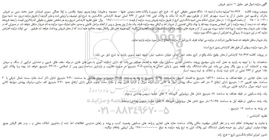بموجب پرونده کلاسه      980697 اجراییه صادره از شعبه 18  دادگاه عمومی حقوقی  کرج  له :  فرخ  تاج  سوری با وکالت محمد سعیدی  علیها  :  معصومه  و علیرضا  وزهرا ومریم  وجواد  واقدس  و  لیلا  همگی  سوری  فرزندان  عزیز  محمد  مبنی  بر  فروش  ماترک  و تقسیم  ثمن  حاصل  از آن  به  نسبت  سهم هر  کدام  از  طرفین سهم  الارث  لذا  ملک  به  پلاک  ثبتی  185  فرعی  از  362  اصلی  توسط  کارشناس  دادگستری  به  شرح ذیل توصیف و ارزیابی شده و مقرر گردیده از طریق مزایده درروز  سه  شنبه مورخ 1400/  8  /  25      از ساعت9صبح تا10  در محل اجرای احکام مدنی شعبه دادگستری کرج از طریق مزایده بفروش برسد. مزایده از قیمت 128/000/000/000    ریال  طبق نظریه کارشناس شروع و به هر شخص حقیقی و حقوقی که بالاترین قیمت را بدهد فروخته خواهد شد. ده درصد از وجه مزایده را فی المجلس بصورت وجه نقد یا چک بانکی تضمینی از خریدار اخذ و الباقی وجه مزایده ظرف یک ماه از وی وصول و پس از انجام مراحل قانونی و صدور حکم تملیک مورد مزایده به نام خریدار منتقل خواهد شد. در صورتی که در مهلت مقرر خریدار وجه مزایده را پرداخت ننماید سپرده وی پس از کسر هزینه های مزایده به نفع دولت ضبط و مزایده تجدید می گردد. کلیه هزینه های نقل وانتقال بعهده محکوم علیه است که از محل فروش پرداخت خواهد شد طرفین    می توانند مزایده اعتراض نمایند که در این صورت تا رسیدگی به اعتراض از سوی دادگاه مورد مزایده