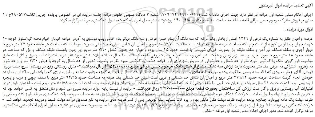 1- عرصه و اعیان طلق به شماره یک فرعی از 1349 اصلی از بخش یک مراغه که سه دانگ آن بنام حسن عراقی و سه دانگ دیگر بنام خانم زینب موسوی به آدرس مراغه خیابان خیام محله گیلاسلوق کوچه شهید جهان پیما اولین کوچه از دست چپ که مساحت عرصه طبق محتویات سند مالکیت 57/70 متر مربع و اعیان آن شامل اعیان حد شمالی بصورت دو طبقه که مساحت هر طبقه حدود 27 متر مربع با دیوار آجری و سقف همکف تیر آهن و سقف طبقه اول بصورت خرپای شیروانی با قدمت حدود 45 سال بوده و اعیان حد جنوبی شامل 3/90 متر مربع زیر زمین بانضمام طبقه همکف و اول که مساحت هر طبقه حدود 18 متر مربع با دیوار آجری و سقف زیر زمین و همکف تیر آهن و سقف آخر خرپای شیروانی با قدمت بالای 40 سال میباشد پلاک ثبتی مورد نظر دارای امتیازات آب و برق و گاز است طبق موقعیت قرار گیری ملک پلاک ثبتی مورد نظر از حد شمال و حد شرقی در تعریض شهرداری قرار خواهد داشت(پلاک ثبتی مورد نظر در وضعیت کنونی از حد شمال به کوچه با عرض 2/30 متر و از حد شرق به راهروی اشتراکی به عرض یک متر مجاورت دارد) ارزش سه دانگ مشاع از شش دانگ مرحوم حسن عراقی مبلغ 1/154/000/000 ریال میباشد.2- منزل روستائی واقع در روستای سرج جنب بربری فروشی آقای جعفر معبودی که فاقد سند رسمی مالکیت بوده و مبایعه نامه عادی و... نیز ندارد ساختمان مورد نظر از حد شمال و غرب به کوچه مجاورت داشته و طبق متراژی که با راهنمایی ساکنان و نماینده خواهان انجام گرفت مساحت عرصه حدود 279/43 متر مربع و اعیان آن شامل حد شمالی و غربی است اعیان حد شمالی یک طبقه به مساحت حدود 92/35 متر مربع با سقف چوبی و درب و پنجره آلومنیومی و با قدمت حدود 21 سال میباشد و اعیان حد غربی با سقف چوبی است که قسمتهایی از سقف به داخل ساختمان ریزش نموده و مساحت آن حدود 50/58 متر مربع است ساختمان فوق دارای امتیازات آب روستایی و برق و گاز است ارزش کل ساختمان بصورت قطعه مبلغ 4/460/000/000 ریال میباشد. - مزایده از قیمت پایه موارد مزایده شروع می شود و مال متعلق به کسی خواهد بود که بالاترین قیمت را پیشنهاد و قبول نماید. - شرکت کنندگان در مزایده می بایست ده درصد مبلغ پایه را به صورت چک تضمینی یا قبل از مزایده به حساب سپرده موقت دادگستری مراغه واریز کند و مابقی را ظرف مهلت یک ماهه بپردازد. چنانچه برنده مزایده ظرف مهلت مقرر مابقی بهاء را پرداخت ننماید مبلغ تودیعی پس از کسر هزینه های مزایده به نفع صندوق درآمد دولت ضبط و مزایده تجدید خواهد شد. - شرکت کنندگان می توانند تا 5 روز قبل از مزایده از ملک مورد مزایده بازدید نمایند. - مزایده در تاریخ 1400/9/8روز دوشنبه ساعت 10 صبح بصورت حضوری در دفترشعبه اول اجرای احکام مدنی دادگستری مراغه برگزار خواهد شد. مدیر اجرای احکام مدنی شعبه اول مراغه - ملکی