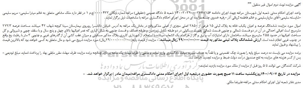 - مزایده در تاریخ 1400/09/07روزیکشنبه ساعت 11 صبح بصورت حضوری درشعبه اول اجرای احکام مدنی دادگستری مراغه(میدان مادر ) برگزار خواهد شد.