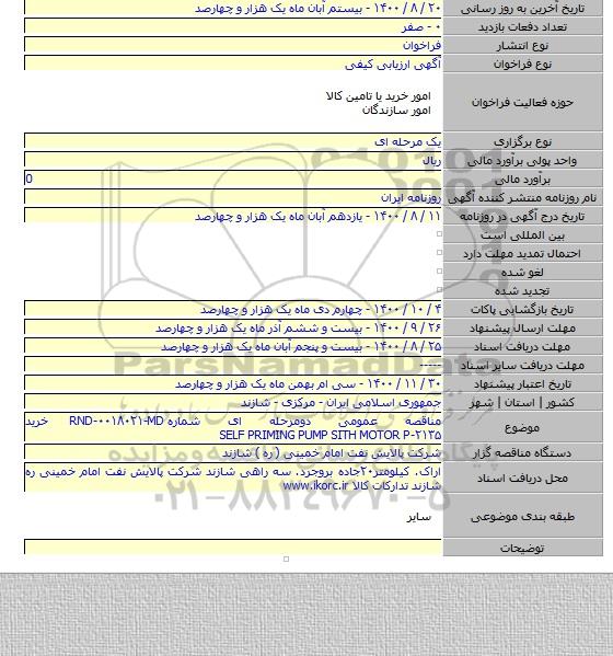 مناقصه عمومی دومرحله ای شماره RND-۰۰۱۸۰۲۱-MD خرید SELF PRIMING PUMP SITH MOTOR P-۲۱۳۵