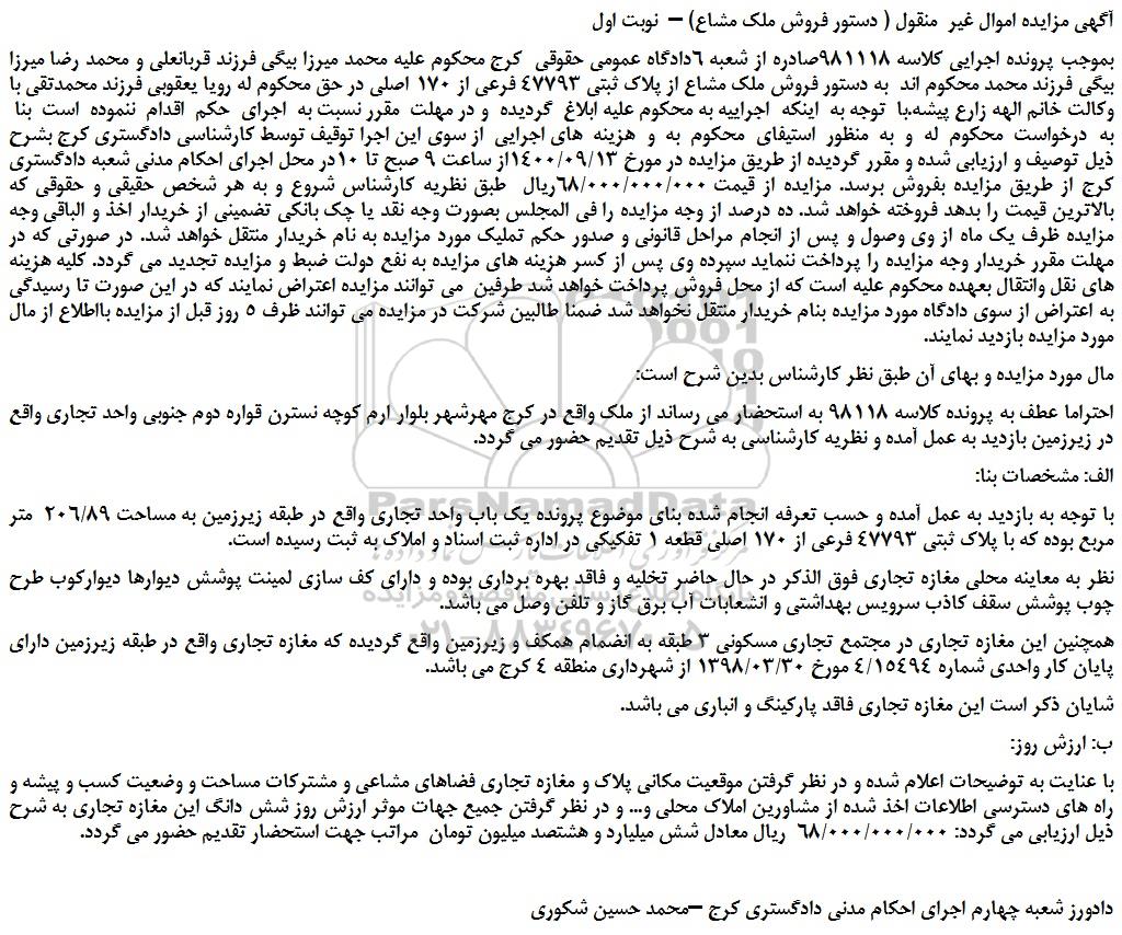 بموجب پرونده اجرایی کلاسه 981118صادره از شعبه 6دادگاه عمومی حقوقی  کرج محکوم علیه محمد میرزا بیگی فرزند قربانعلی و محمد رضا میرزا بیگی فرزند محمد محکوم اند  به دستور فروش ملک مشاع از پلاک ثبتی 47793 فرعی از 170 اصلی در حق محکوم له رویا یعقوبی فرزند محمدتقی با وکالت خانم الهه زارع پیشه.با  توجه به  اینکه  اجراییه به محکوم علیه ابلاغ  گردیده  و در مهلت  مقرر نسبت به  اجرای  حکم  اقدام  ننموده  است  بنا  به  درخواست  محکوم  له  و  به  منظور  استیفای  محکوم  به  و  هزینه  های اجرایی  از سوی این اجرا توقیف توسط کارشناسی دادگستری کرج بشرح ذیل توصیف و ارزیابی شده و مقرر گردیده از طریق مزایده در مورخ 1400/09/13از ساعت 9 صبح تا 10در محل اجرای احکام مدنی شعبه دادگستری کرج از طریق مزایده بفروش برسد. مزایده از قیمت 68/000/000/000ریال  طبق نظریه کارشناس شروع و به هر شخص حقیقی و حقوقی که بالاترین قیمت را بدهد فروخته خواهد شد. ده درصد از وجه مزایده را فی المجلس بصورت وجه نقد یا چک بانکی تضمینی از خریدار اخذ و الباقی وجه مزایده ظرف یک ماه از وی وصول و پس از انجام مراحل قانونی و صدور حکم تملیک مورد مزایده به نام خریدار منتقل خواهد شد. در صورتی که در مهلت مقرر خریدار وجه مزایده را پرداخت ننماید سپرده وی پس از کسر هزینه های مزایده به نفع دولت ضبط و مزایده تجدید می گردد. کلیه هزینه های نقل وانتقال بعهده محکوم علیه است که از محل فروش پرداخت خواهد شد طرفین  می توانند مزایده اعتراض نمایند که در این صورت تا رسیدگی به اعتراض از سوی دادگاه مورد مزایده بنام خریدار منتقل نخواهد شد ضمنا طالبین شرکت در مزایده می توانند ظرف 5 روز قبل از مزایده بااطلاع از مال مورد مزایده بازدید نمایند.