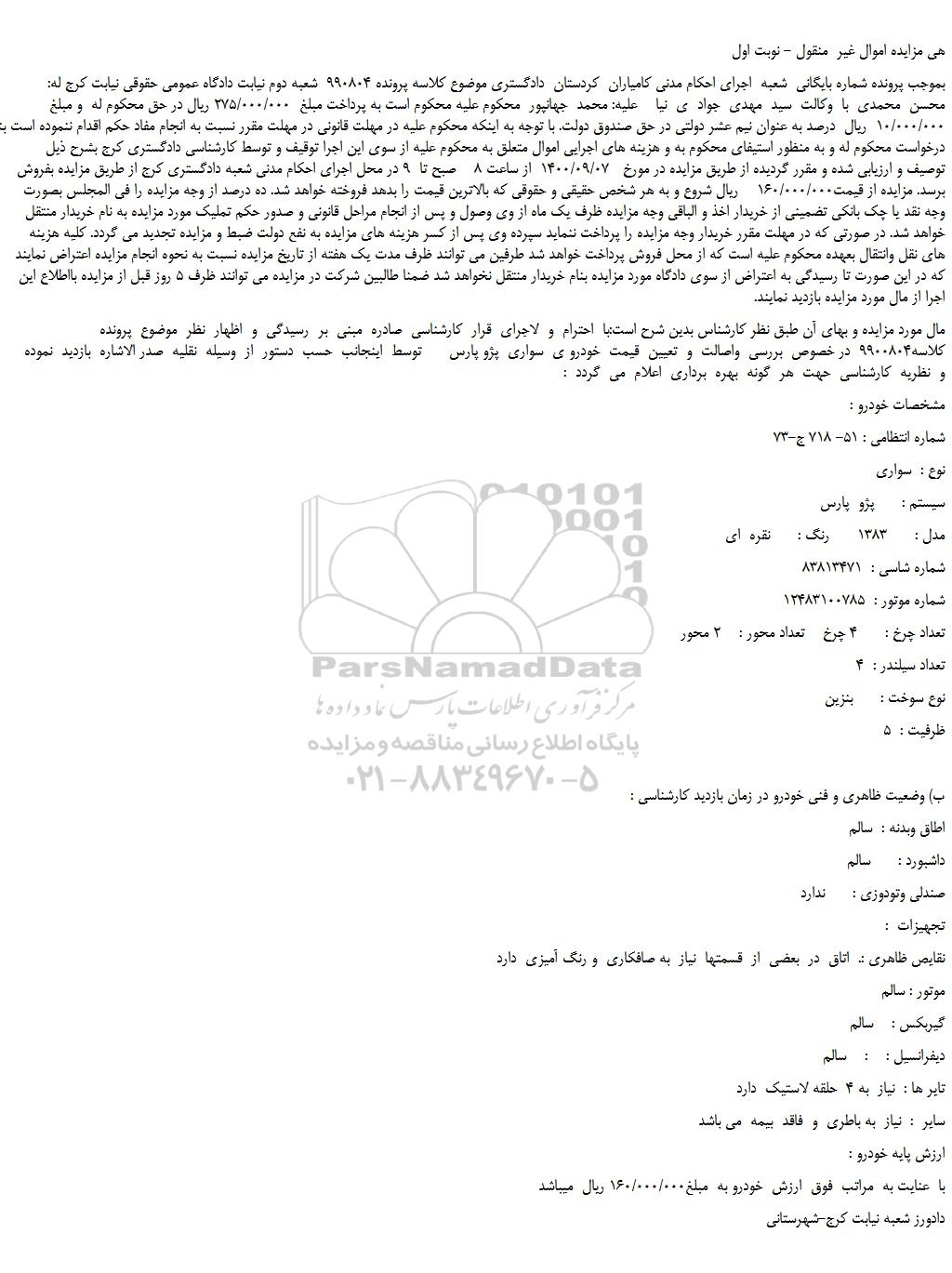 مال مورد مزایده و بهای آن طبق نظر کارشناس بدین شرح است:با احترام و لاجرای قرار کارشناسی صادره مبنی بر رسیدگی و اظهار نظر موضوع پرونده کلاسه9900804 در خصوص بررسی واصالت و تعیین قیمت خودرو ی سواری پژو پارس توسط اینجانب حسب دستور از وسیله نقلیه صدر الاشاره بازدید نموده و نظریه کارشناسی حهت هر گونه بهره برداری اعلام می گردد :