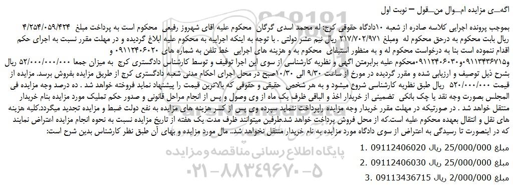 بموجب پرونده اجرایی کلاسه صادره از شعبه 10دادگاه حقوقی کرج: له محمد اسدی گرگان محکوم علیه اقای شهروز رفیعی محکوم است به پرداخت مبلغ 4/254/059/424 ریال بابت محکوم به درحق محکوم له ومبلغ 217/702/971 ریال نیم عشر دولتی . با توجه به اینکه اجراییه به محکوم علیه ابلاغ گردیده و در مهلت مقرر نسبت به اجرای حکم اقدام ننموده است بنا به درخواست محکوم له و به منظور استیفای محکوم به و هزینه های اجرایی خط تلفن به شماره های 09112406020 و و09113436715و09112406030محکوم علیه برابرمتن اگهی و نظریه کارشناسی از سوی این اجرا توقیف و توسط کارشناس دادگستری کرج به میزان جمعا 52/000/000/000 ریال بشرح ذیل توصیف و ارزیابی شده و مقرر گردیده در مورخ از ساعت 9/30 الی 10/30صبح در محل اجرای احکام مدنی شعبه دادگستری کرج از طریق مزایده بفروش برسد. مزایده از قیمت 520/000/000 ریال طبق نظریه کارشناسی شروع میشود و به هر شخص حقیقی و حقوقی که بالاترین قیمت را پیشنهاد نماید فروخته خواهد شد . ده درصد وجه مزایده فی المجلس بصورت وجه نقد یا چک بانکی تضمینی از خریدار اخذ و الباقی ظرف یک ماه از وی وصول و پس از انجام مراحل قانونی و صدور حکم تملیک مورد مزایده بنام خریدار منتقل خواهد شد . در صورتیکه در مهلت مقرر خریدار وجه مزایده راپرداخت ننماید سپرده وی پس از کسر هزینه های مزایده به نفع دولت ضبط و مزایده تجدید میگردد.کلیه هزینه های نقل و انتقال بعهده محکوم علیه است.که از محل فروش پرداخت خواهد شد.طرفین میتوانند ظرف مدت یک هفته از تاریخ مزایده نسبت به نحوه انجام مزایده اعتراض نمایند که در اینصورت تا رسیدگی به اعتراض از سوی دادگاه مورد مزایده به نام خریدار منتقل نخواهد شد.. مال مورد مزایده و بهای آن طبق نظر کارشناس بدین شرح است: