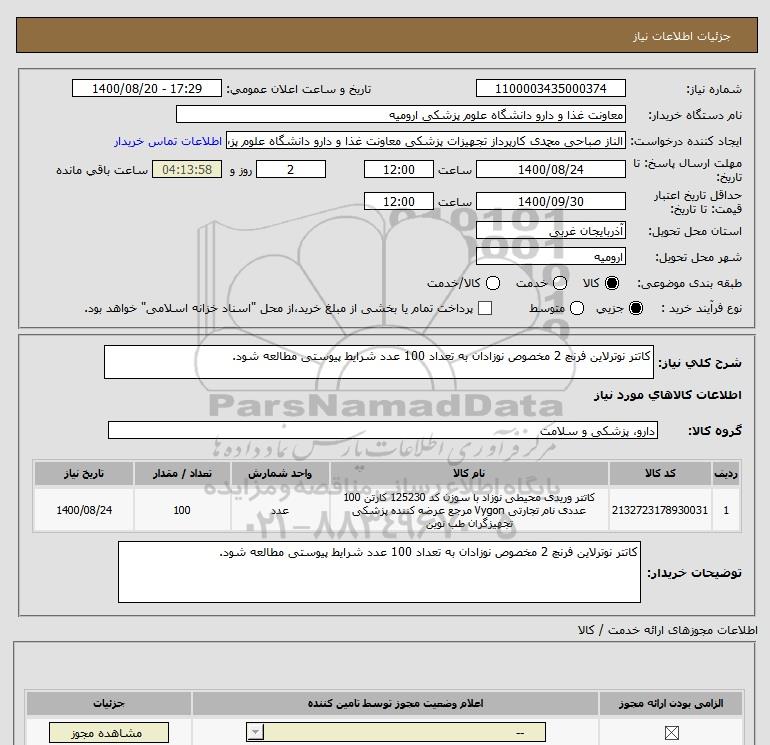 شرح کلی نیاز: کاتتر نوترلاین فرنچ 2 مخصوص نوزادان به تعداد 100 عدد شرایط پیوستی مطالعه شود.