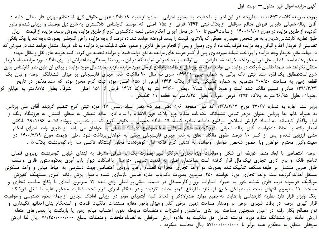 بموجب پرونده کلاسه 0000653  مطروحه  در  این اجرا  و  با عنایت  به  صدور  اجرایی    صادره از شعبه  19 دادگاه عمومی حقوقی کرج  له : خانم مهری  فارسیجانی  علیه  : آقای  یداله شعبانی  دایر بر  فروش  منافع  سرقفلی  از پلاک ثبتی  1494  فرعی  از  155  اصلی  که  توسط  کارشناس  دادگستری  به شرح ذیل توصیف و ارزیابی شده و مقرر گردیده از طریق مزایده در مورخ 1400/09/01  از ساعت9صبح تا  10  در محل اجرای احکام مدنی شعبه دادگستری کرج از طریق مزایده بفروش برسد. مزایده از قیمت    ریال  طبق نظریه کارشناس شروع و به هر شخص حقیقی و حقوقی که بالاترین قیمت را بدهد فروخته خواهد شد. ده درصد از وجه مزایده را فی المجلس بصورت وجه نقد یا چک بانکی تضمینی از خریدار اخذ و الباقی وجه مزایده ظرف یک ماه از وی وصول و پس از انجام مراحل قانونی و صدور حکم تملیک مورد مزایده به نام خریدار منتقل خواهد شد. در صورتی که در مهلت مقرر خریدار وجه مزایده را پرداخت ننماید سپرده وی پس از کسر هزینه های مزایده به نفع دولت ضبط و مزایده تجدید می گردد. کلیه هزینه های نقل وانتقال بعهده محکوم علیه است که از محل فروش پرداخت خواهد شد طرفین    می توانند مزایده اعتراض نمایند که در این صورت تا رسیدگی به اعتراض از سوی دادگاه مورد مزایده بنام خریدار منتقل نخواهد شد ضمنا طالبین شرکت در مزایده می توانند ظرف 5 روز قبل از مزایده بااطلاع از مال مورد مزایده بازدید نمایند.مال مورد مزایده و بهای آن طبق نظر کارشناس بدین شرح است:مطابق  یک فقره  سند  ثبتی  تک  برگی  به  شماره  چاپی  069921  سری ب  سال  90 مالکیت  خانم  مهری  فارسیجانی  بر  میزان  ششدانگ  عرصه  واعیان  یک  قطعه  زمین  به  مساحت  208/50  مترمربع  به  شماره  تفکیکی  یک  از  پلاک  1494  فرعی  از  155  اصلی  حوزه  ثبت  کرج  محرز  بوده  که  سند مذکور  در  تاریخ  1391/3/23  صادر و  تسلیم  مالک  شده  است  و حدود  اربعه  : شمالاً  : بطول  23/60  متر  به  پلاک  1492  فرعی  از  151  اصلی      .شرقاً :  بطول  8/75 متر  به  خیابان  گوهردشت  .جنوبا ً  : بطول  26/95 متر به  پلاک  1494  فرعی  .غرباً  :  بطول  8/25 متر  به  قطعه  11  تفکیکی  .