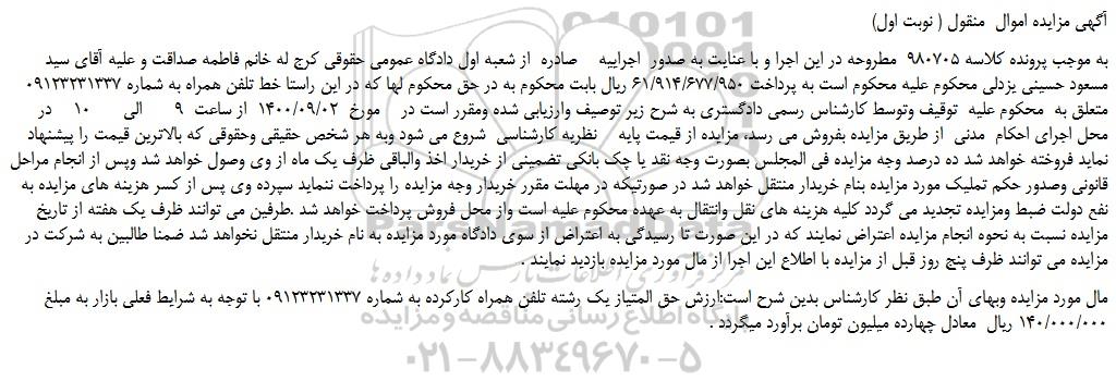 به موجب پرونده کلاسه 980705 مطروحه در این اجرا و با عنایت به صدور اجراییه صادره از شعبه اول دادگاه عمومی حقوقی کرج له خانم فاطمه صداقت و علیه آقای سید مسعود حسینی یزدلی محکوم علیه محکوم است به پرداخت 61/914/677/950 ریال بابت محکوم به در حق محکوم لها که در این راستا خط تلفن همراه به شماره 09123231337 متعلق به محکوم علیه توقیف وتوسط کارشناس رسمی دادگستری به شرح زیر توصیف وارزیابی شده ومقرر است در مورخ 1400/09/02 از ساعت 9 الی 10 در محل اجرای احکام مدنی از طریق مزایده بفروش می رسد، مزایده از قیمت پایه نظریه کارشناسی شروع می شود وبه هر شخص حقیقی وحقوقی که بالاترین قیمت را پیشنهاد نماید فروخته خواهد شد ده درصد وجه مزایده فی المجلس بصورت وجه نقد یا چک بانکی تضمینی از خریدار اخذ والباقی ظرف یک ماه از وی وصول خواهد شد وپس از انجام مراحل قانونی وصدور حکم تملیک مورد مزایده بنام خریدار منتقل خواهد شد در صورتیکه در مهلت مقرر خریدار وجه مزایده را پرداخت ننماید سپرده وی پس از کسر هزینه های مزایده به نفع دولت ضبط ومزایده تجدید می گردد کلیه هزینه های نقل وانتقال به عهده محکوم علیه است واز محل فروش پرداخت خواهد شد .طرفین می توانند ظرف یک هفته از تاریخ مزایده نسبت به نحوه انجام مزایده اعتراض نمایند که در این صورت تا رسیدگی به اعتراض از سوی دادگاه مورد مزایده به نام خریدار منتقل نخواهد شد ضمنا طالبین به شرکت در مزایده می توانند ظرف پنج روز قبل از مزایده با اطلاع این اجرا از مال مورد مزایده بازدید نمایند .
