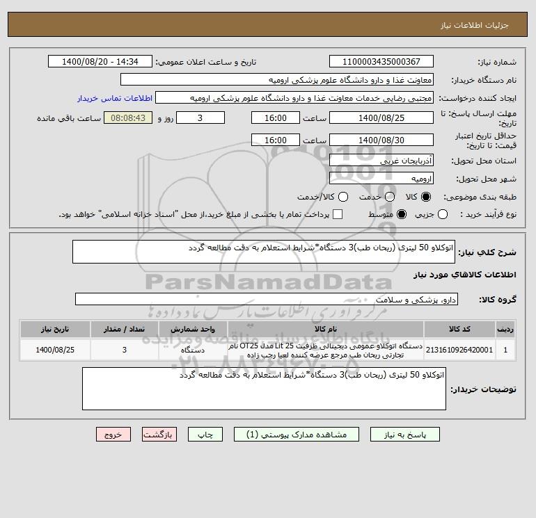 استعلام اتوکلاو 50 لیتری (ریحان طب)3 دستگاه*شرایط استعلام به دقت مطالعه گردد, استعلام اتوکلاو 50 لیتری (ریحان طب)3 دستگاه*شرایط استعلام به دقت مطالعه گردد