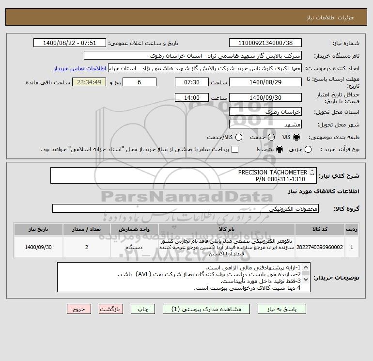 نام دستگاه خریدار:شرکت پالایش گاز شهید هاشمی نژاد استان خراسان رضوی