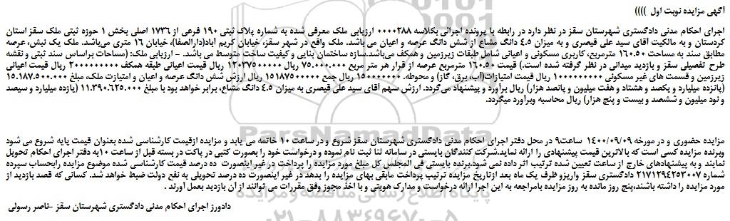 اجرای احکام مدنی دادگستری شهرستان سقز در نظر دارد در رابطه با پرونده اجرائی بکلاسه 0000288 ارزیابی ملک معرفی شده به شماره پلاک ثبتی 190 فرعی از 1736 اصلی بخش 1 حوزه ثبتی ملک سقز استان کردستان و به مالکیت آقای سید علی قیصری و به میزان 4.5 دانگ مشاع از شش دانگ عرصه و اعیان می باشد. ملک واقع در شهر سقز، خیابان کریم آباد(دارالصفا)، خیابان 16 متری میباشد. ملک یک نبش، عرصه مطابق سند به مساحت 160.50 مترمربع، کاربری مسکونی و اعیانی شامل طبقات زیرزمین و همکف میباشد.سازه ساختمان بنایی و کیفیت ساخت متوسط می باشد. - ارزیابی ملک: (مساحات براساس سند ثبتی و نقشه طرح تفصیلی سقز و بازدید میدانی در نظر گرفته شده است.) قیمت 160.50 مترمربع عرصه از قرار هر متر مربع 75.000.000 ریال 12037500000 ریال قیمت اعیانی طبقه همکف 2000000000 ریال قیمت اعیانی زیرزمین و قسمت های غیر مسکونی 1000000000 ریال قیمت امتیازات(آب، برق، گاز) و محوطه. 150000000 ریال جمع 15187500000 ریال ارزش شش دانگ عرصه و اعیان و امتیازت ملک، مبلغ 15.187.500.000 (پانزده میلیارد و یکصد و هشتاد و هفت میلیون و پانصد هزار) ریال برآورد و پیشنهاد میگردد. ارزش سهم آقای سید علی قیصری به میزان 4.5 دانگ مشاع، برابر خواهد بود با مبلغ 11.390.625.000 (یازده میلیارد و سیصد و نود میلیون و ششصد و بیست و پنج هزار) ریال محاسبه وبرآورد میگردد.