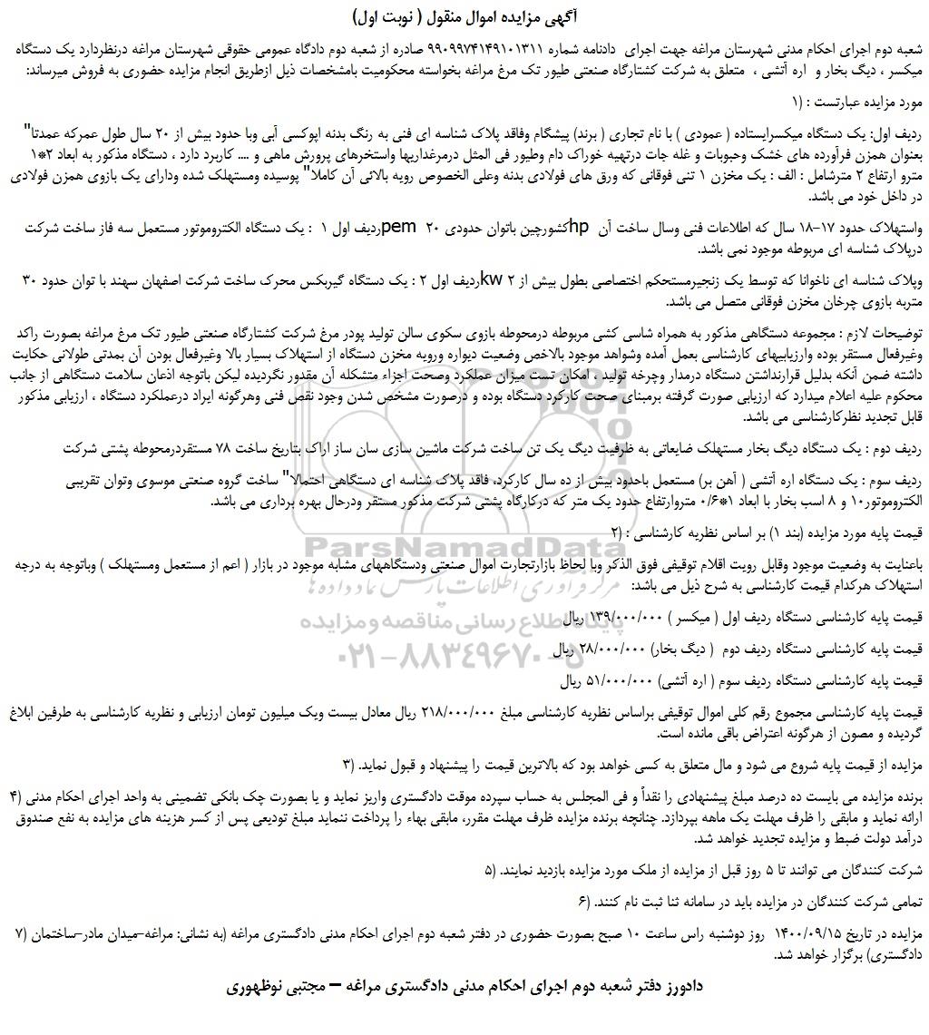 شعبه دوم اجرای احکام مدنی شهرستان مراغه جهت اجرای دادنامه شماره 9909974149101311 صادره از شعبه دوم دادگاه عمومی حقوقی شهرستان مراغه درنظردارد یک دستگاه میکسر ، دیگ بخار و اره آتشی ، متعلق به شرکت کشتارگاه صنعتی طیور تک مرغ مراغه بخواسته محکومیت بامشخصات ذیل ازطریق انجام مزایده حضوری به فروش میرساند: