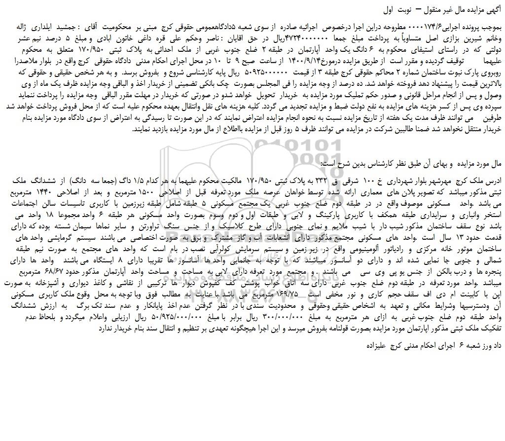 بموجب پرونده اجرایی0000174/6 مطروحه دراین اجرا درخصوص اجرائیه صادره از سوی شعبه 5دادگاهعمومی حقوقی کرج مبنی بر محکومیت آقای : جمشید ایلداری ژاله وخانم شیرین بزازی اصل متساویاً به پرداخت مبلغ جمعا 47240000000ریال در حق اقایان : ناصر وحکم علی قره داغی خاتون ابادی و مبلغ 5 درصد نیم عشر دولتی که در راستای استیفای محکوم به 6 دانگ یک واحد آپارتمان در طبقه 2 ضلع جنوب غربی از ملک احداثی به پلاک ثبتی 170/950 متعلق به محکوم علیهما توقیف گردیده و مقرر است از طریق مزایده درمورخ1400/9/14 از ساعت صبح 9 تا 10 در محل اجرای احکام مدنی دادگاه حقوقی کرج واقع در بلوار ملاصدرا روبروی پارک نبوت ساختمان شماره 2 محاکم حقوقی کرج طبقه 3 از قیمت 50925000000 ریال پایه کارشناسی شروع و بفروش برسد. و به هر شخص حقیقی و حقوقی که بالاترین قیمت را پیشنهاد دهد فروخته خواهد شد. ده درصد از وجه مزایده را فی المجلس بصورت چک بانکی تضمینی از خریدار اخذ و الباقی وجه مزایده ظرف یک ماه از وی وصول و پس از انجام مراحل قانونی و صدور حکم تملیک مورد مزایده به خریدار تحویل خواهد شدو در صورتی که خریدار در مهلت مقرر الباقی وجه مزایده را پرداخت ننماید سپرده وی پس از کسر هزینه های مزایده به نفع دولت ضبط و مزایده تجدید می گردد. کلیه هزینه های نقل وانتقال بعهده محکوم علیه است که از محل فروش پرداخت خواهد شد طرفین می توانند ظرف مدت یک هفته از تاریخ مزایده نسبت به نحوه انجام مزایده اعتراض نمایند که در این صورت تا رسیدگی به اعتراض از سوی دادگاه مورد مزایده بنام خریدار منتقل نخواهد شد ضمنا طالبین شرکت در مزایده می توانند ظرف 5 روز قبل از مزایده بااطلاع از مال مورد مزایده بازدید نمایند.