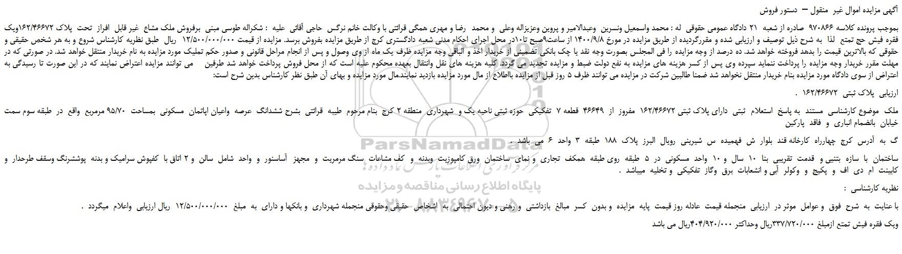 بموجب پرونده کلاسه 970866 صادره از شعبه 21 دادگاه عمومی حقوقی له : محمد واسمعیل ونسرین وعبدالامیر و پروین وعزیزاله وعلی و محمد رضا و مهری همگی قرائتی با وکالت خانم نرگس حاجی آقائی علیه : شکراله طوسی مبنی برفروش ملک مشاع غیر قابل افراز تحت پلاک 162/46672ویک فقره فیش حج تمتع لذا به شرح ذیل توصیف و ارزیابی شده و مقررگردیده از طریق مزایده در مورخ 1400/9/8 از ساعت9صبح تا10در محل اجرای احکام مدنی شعبه دادگستری کرج از طریق مزایده بفروش برسد. مزایده از قیمت 12/500/000/000 ریال طبق نظریه کارشناس شروع و به هر شخص حقیقی و حقوقی که بالاترین قیمت را بدهد فروخته خواهد شد. ده درصد از وجه مزایده را فی المجلس بصورت وجه نقد یا چک بانکی تضمینی از خریدار اخذ و الباقی وجه مزایده ظرف یک ماه از وی وصول و پس از انجام مراحل قانونی و صدور حکم تملیک مورد مزایده به نام خریدار منتقل خواهد شد. در صورتی که در مهلت مقرر خریدار وجه مزایده را پرداخت ننماید سپرده وی پس از کسر هزینه های مزایده به نفع دولت ضبط و مزایده تجدید می گردد. کلیه هزینه های نقل وانتقال بعهده محکوم علیه است که از محل فروش پرداخت خواهد شد طرفین می توانند مزایده اعتراض نمایند که در این صورت تا رسیدگی به اعتراض از سوی دادگاه مورد مزایده بنام خریدار منتقل نخواهد شد ضمنا طالبین شرکت در مزایده می توانند ظرف 5 روز قبل از مزایده بااطلاع از مال مورد مزایده بازدید نمایند.مال مورد مزایده و بهای آن طبق نظر کارشناس بدین شرح است:
