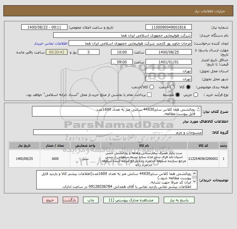 شرح کلی نیاز: روبالشتی هما کلاس سایز44X30 سانتی متر به تعداد 1600عدد فایل پیوست مطالعه.