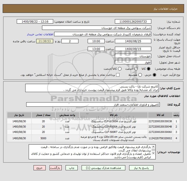شرح کلی نیاز: کاتریج شرکت تارا - پاکت پستی ایران کد مشابه بوده وکالا طبق فرم پیشنهاد قیمت پیوست خریداری می گردد .