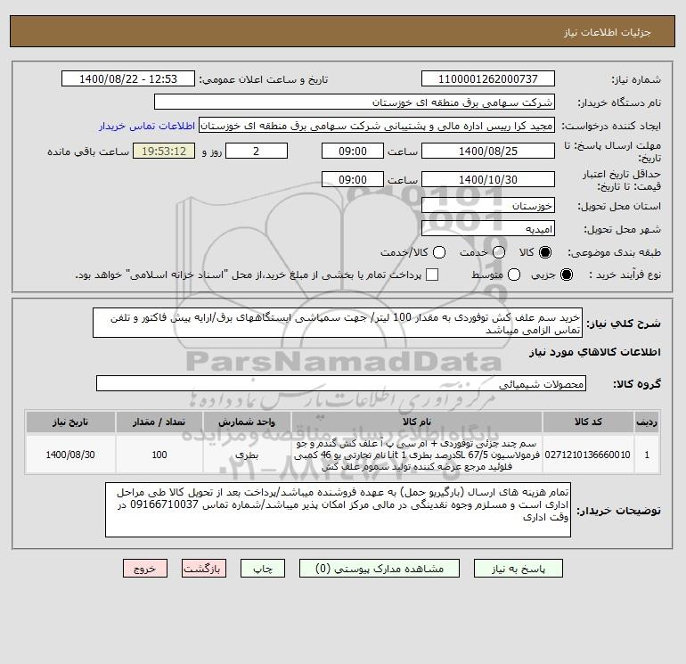 شرح کلی نیاز: خرید سم علف کش توفوردی به مقدار 100 لیتر/ جهت سمپاشی ایستگاههای برق/ارایه پیش فاکتور و تلفن تماس الزامی میباشد