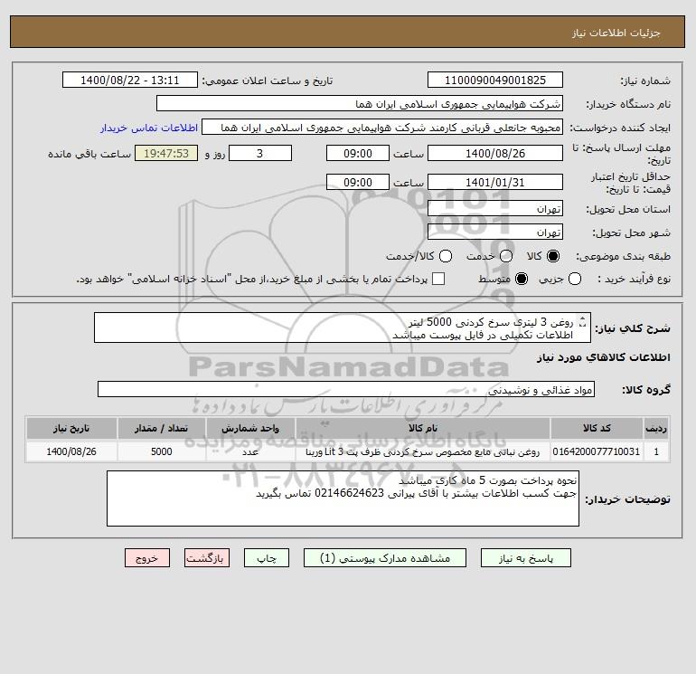 شرح کلی نیاز: روغن 3 لیتری سرخ کردنی 5000 لیتر