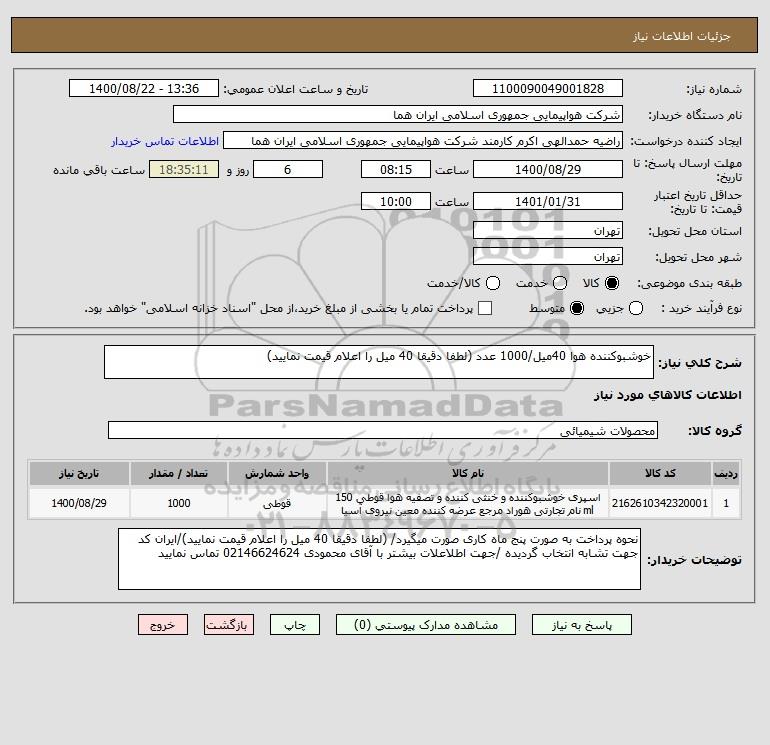 شرح کلی نیاز: خوشبوکننده هوا 40میل/1000 عدد (لطفا دقیقا 40 میل را اعلام قیمت نمایید)