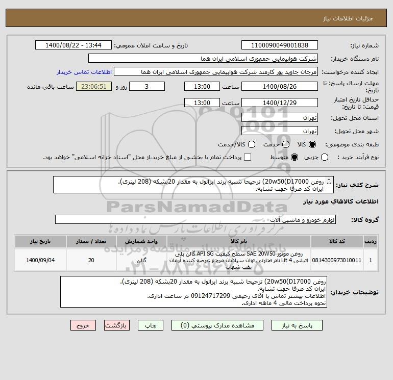 توضیحات خریدار:روغن 20w50(D17000) ترجیحا شبیه برند ایرانول به مقدار 20بشکه (208 لیتری). ایران کد صرفا جهت تشابه. اطلاعات بیشتر تماس با آقای رحیمی 09124717299 در ساعت اداری. نحوه پرداخت مالی 4 ماهه اداری.