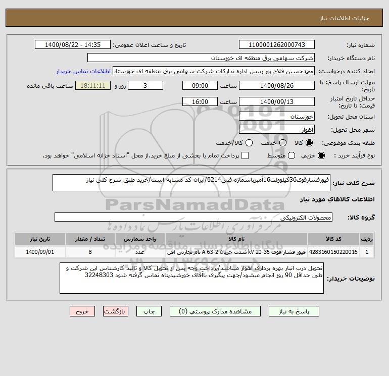 شرح کلی نیاز: فیوزفشارقوی36کیلوولت16آمپرباشماره فنی0214/ایران کد مشابه است/خرید طبق شرح کلی نیاز