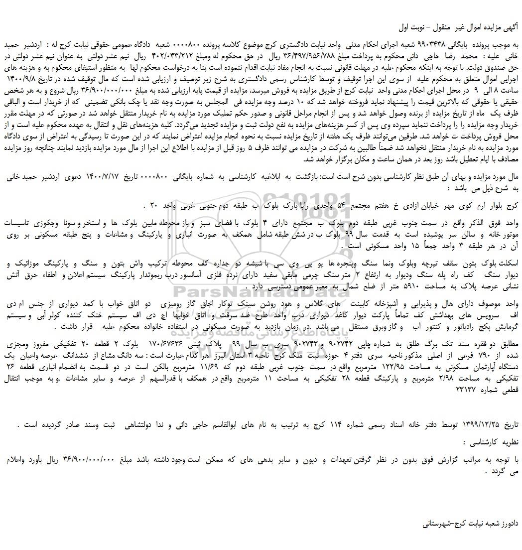 به موجب پرونده بایگانی 9903438 شعبه اجرای احکام مدنی واحد نیابت دادگستری کرج موضوع کلاسه پرونده 0000800 شعبه دادگاه عمومی حقوقی نیابت کرج له : اردشیر حمید خانی علیه : محمد رضا حاجی دائی محکوم به پرداخت مبلغ 36/497/956/788 ریال در حق محکوم له ومبلغ 402/043/212 ریال نیم عشر دولتی به عنوان نیم عشر دولتی در حق صندوق دولت. با توجه به اینکه محکوم علیه در مهلت قانونی نسبت به انجام مفاد نیابت اقدام ننموده است بنا به درخواست محکوم لها به منظور استیفای محکوم به و هزینه های اجرایی اموال متعلق به محکوم علیه از سوی این اجرا توقیف و توسط کارشناس رسمی دادگستری به شرح زیر توصیف و ارزیابی شده است که مال توقیف شده در تاریخ 1400/9/8 ساعت 8 الی 9 در محل اجرای احکام مدنی واحد نیابت کرج از طریق مزایده به فروش میرسد، مزایده از قیمت پایه ارزیابی شده به مبلغ 36/900/000/000 ریال شروع و به هر شخص حقیقی یا حقوقی که بالاترین قیمت را پیشنهاد نماید فروخته خواهد شد که ۱۰ درصد وجه مزایده فی المجلس به صورت وجه نقد یا چک بانکی تضمینی که از خریدار است و الباقی ظرف یک ماه از تاریخ مزایده از برنده وصول خواهد شد و پس از انجام مراحل قانونی و صدور حکم تملیک مورد مزایده به نام خریدار منتقل خواهد شد در صورتی که در مهلت مقرر خریدار وجه مزایده را را پرداخت ننماید سپرده وی پس از کسر هزینه های مزایده به نفع دولت ثبت و مزایده تجدید می گردد. کلیه هزینه های نقل و انتقال به عهده محکوم علیه است و از محل فروش پرداخت ت خواهد شد. طرفین می توانند ظرف یک هفته از تاریخ مزایده نسبت به نحوه انجام مزایده اعتراض نمایند که در این صورت تا رسیدگی به اعتراض از سوی دادگاه مورد مزایده به نام خریدار منتقل نخواهد شد ضمناً طالبین به شرکت در مزایده می توانند ظرف ۵ روز قبل از مزایده با اطلاع این اجرا از مال مورد مزایده بازدید نمایند چنانچه روز مزایده مصادف با ایام تعطیل باشد روز بعد در همان ساعت و مکان برگزار خواهد شد.